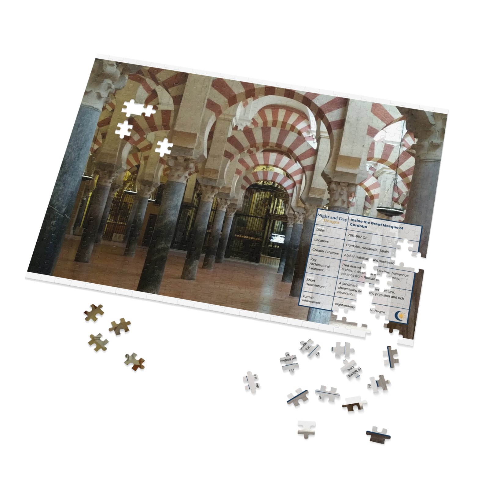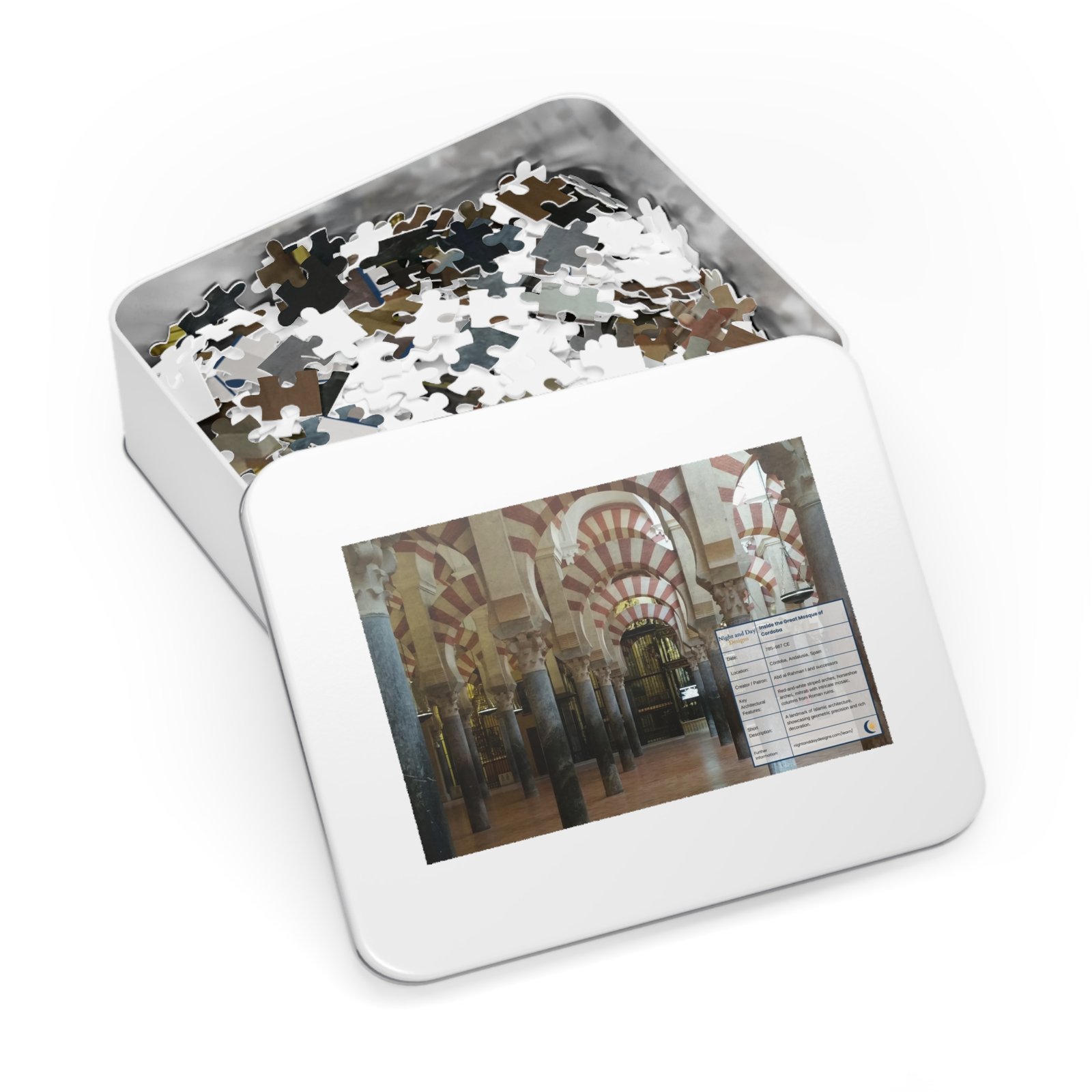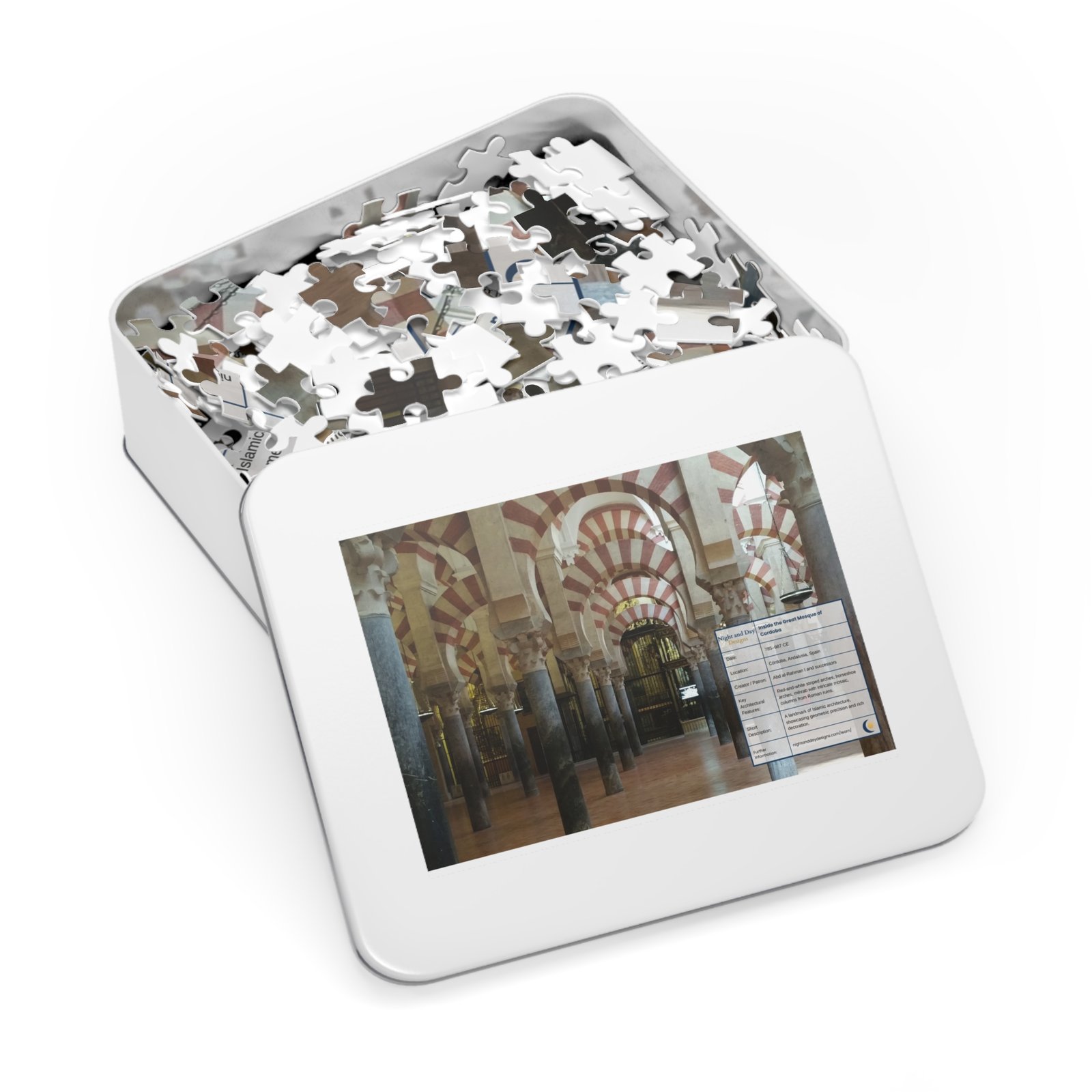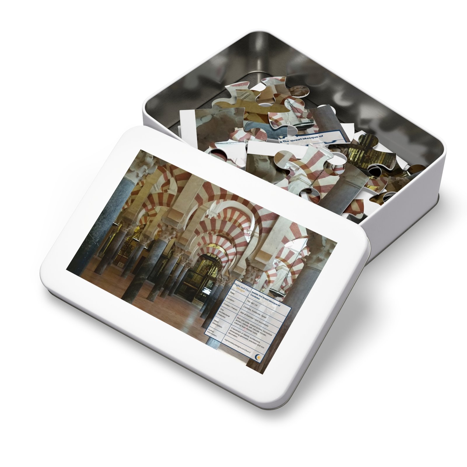 Celebrate the beauty of Al-Andalus with this Córdoba Mosque puzzle. Vibrant, glossy pieces and gift-ready box for Muslim families and history lovers. Relevant for Eid, Ramadan, or just an ordinary day. The white metal tin keeps the puzzle safe between sessions and features the finished image on its lid — a compact keepsake that lives on a shelf or accompanies you on travel.